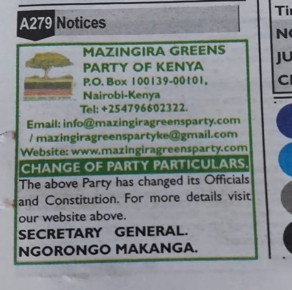 Change of Party Particulars Mazingira Greens Party a has changed its officials and constitution.